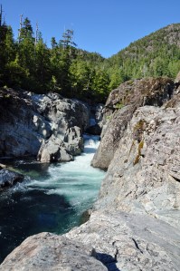 Guess what, I was right. There certainly was more amazing scenery. It’s an incredible road from the east to the west coast of Vancouver Island. You travel through mountains, lakes, rocky hills and rainforests to end up at a coast line that has soft sand beaches and rugged rocks. On the way we stopped at what the locals call ‘Rocky Corner’, a spot where the Kennedy River passes over huge boulders creating waterfalls and rock pools. Jack and I had a great time trying to catch the biggest tadpoles I’d ever seen!
