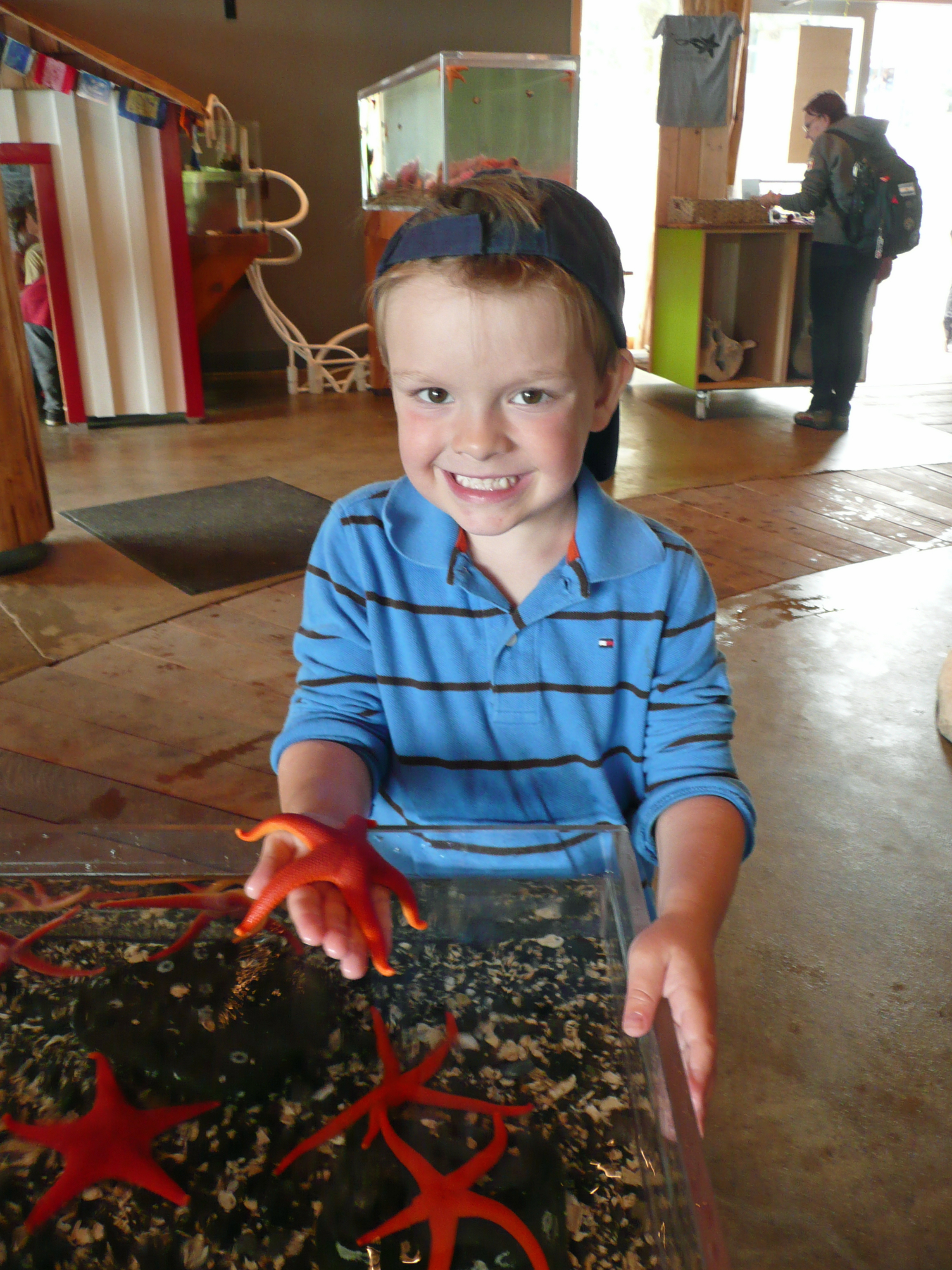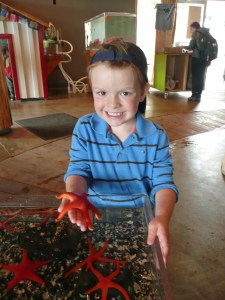 We made it back to cabin after a couple of hours for a quick lunch before heading back out to visit the Uclulet Aquarium and do a spot of fishing off ‘Whisky Dock’. The aquarium was great fun, although only very small, it had lots of open tanks where you were free to touch and hold the sea creatures inside. Jack, Granny and I held starfish (harder than you think), sea cucumbers (very slimy and squidgy) and touched all sorts of other things, including a starfish that smelt of garlic as you stroked it! While we were enjoying ourselves, Jonathan and Granpops sorted out the fishing licences. We’d heard there was a school of mackerel in the area, and apparently, when one bites, they all bite and have a feeding frenzy, so it should be highly likely we’d get a catch. Well, that’s all well and good in theory, but in practice it was another matter. A couple of hours later, the boys had only one catch, a small mackerel caught on Jacks tiny rod by Jonathan, too small to go on the BBQ so back it went.